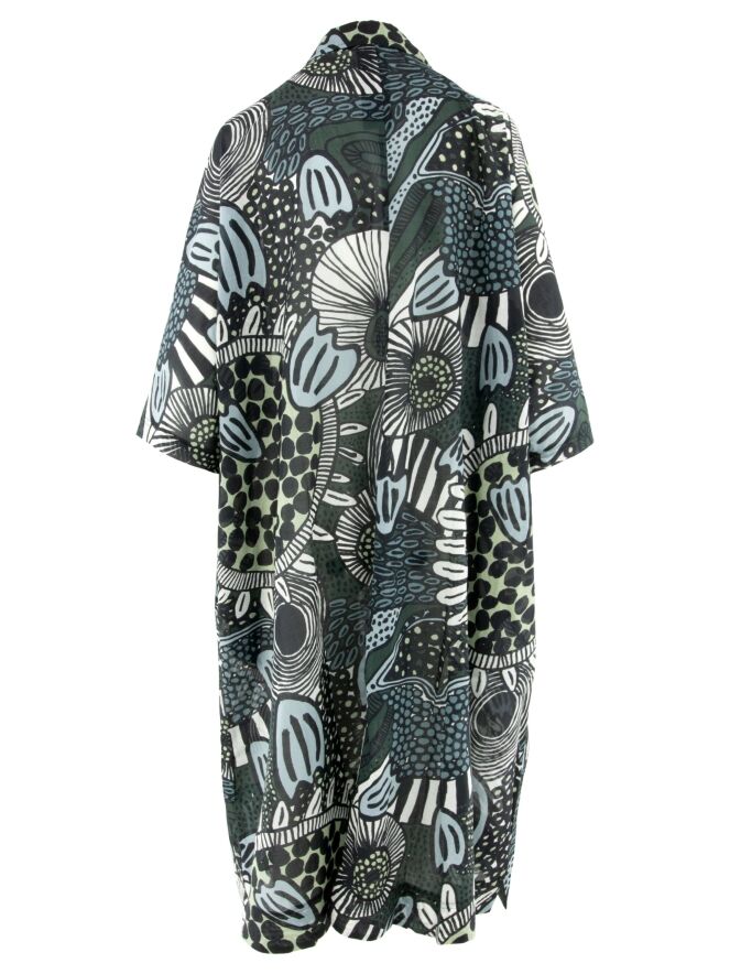 Long blouse or vest by Rundholz Black Label featuring a graphic Art Deco print in multiple shades of green, such as mint and olive, combined with petrol blue, black and white. The piece has short sleeves and can be worn closed or open as a comfortable layering vest, offering a versatile and contemporary look. This blouse can be washed at 30 degrees.