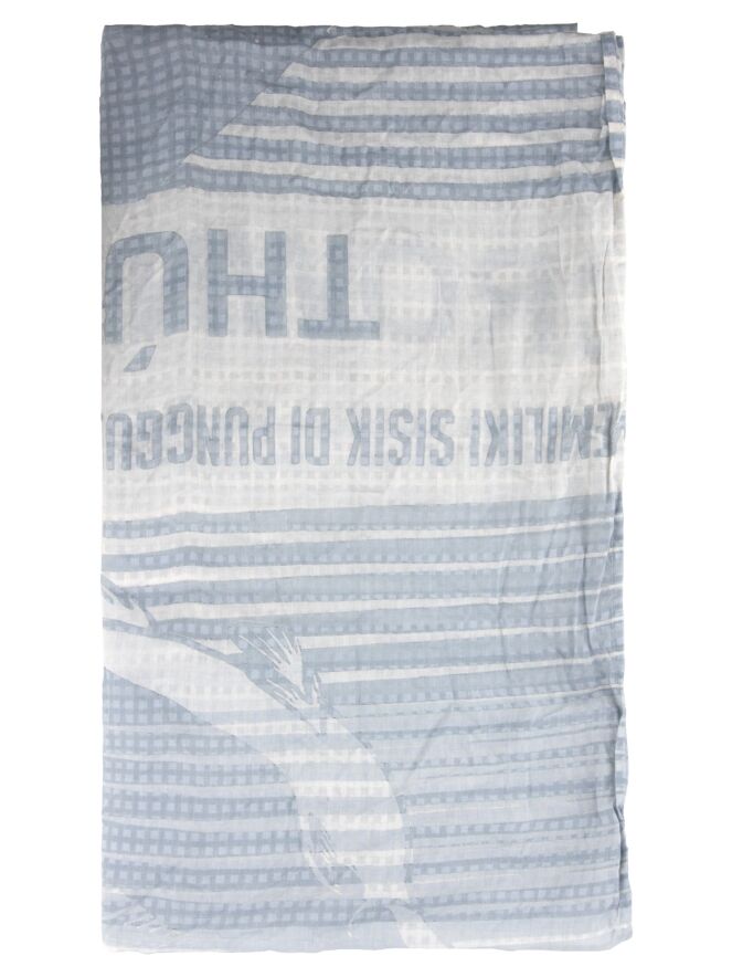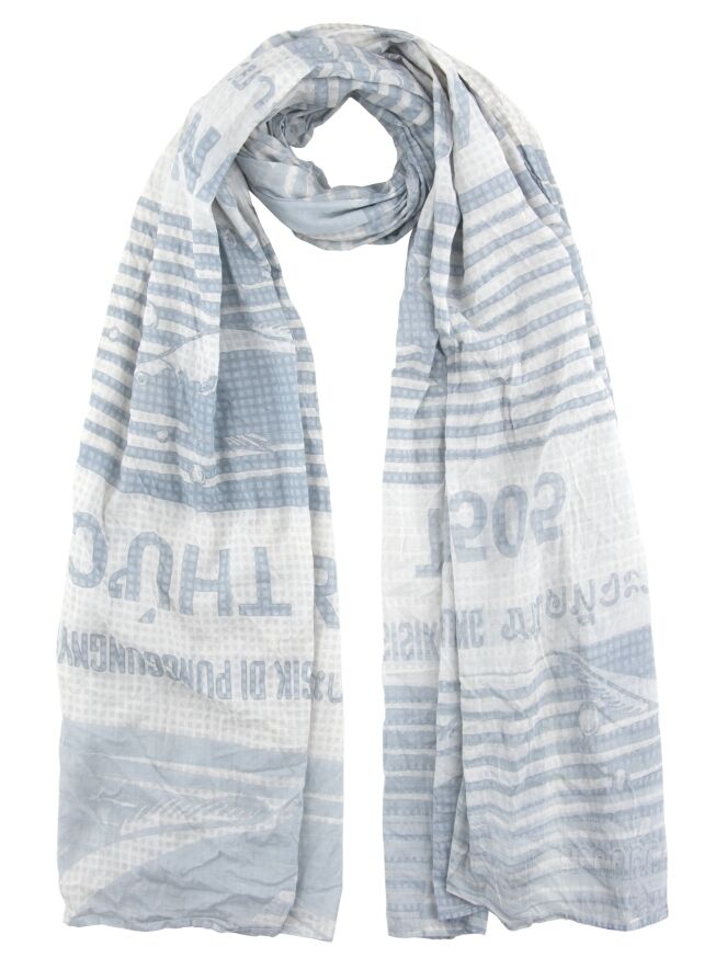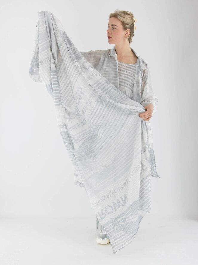 A lightly transparent scarf from Rundholz Black Label with a print featuring text and a block pattern. The print includes various shades of grey combined with white. This scarf can be washed at 30 degrees.