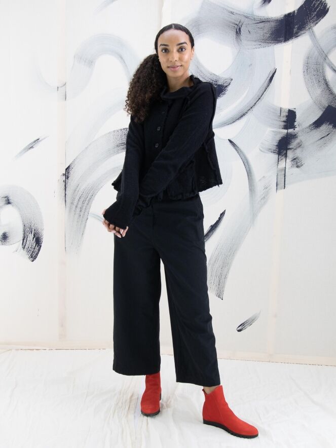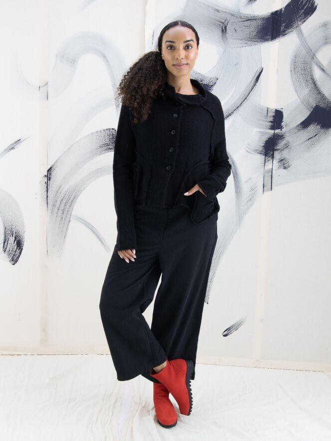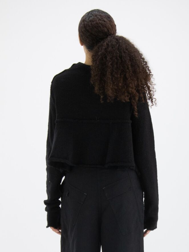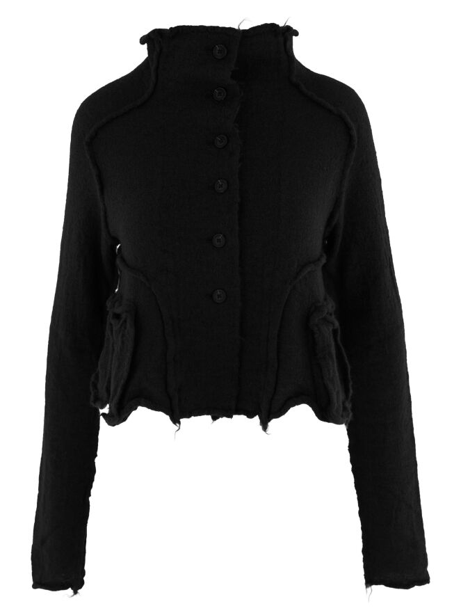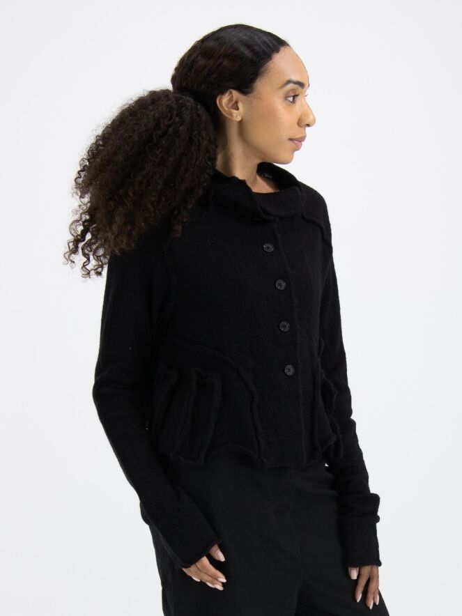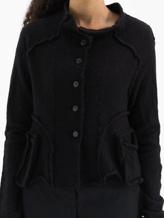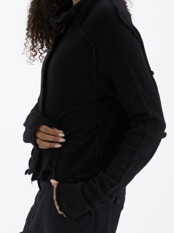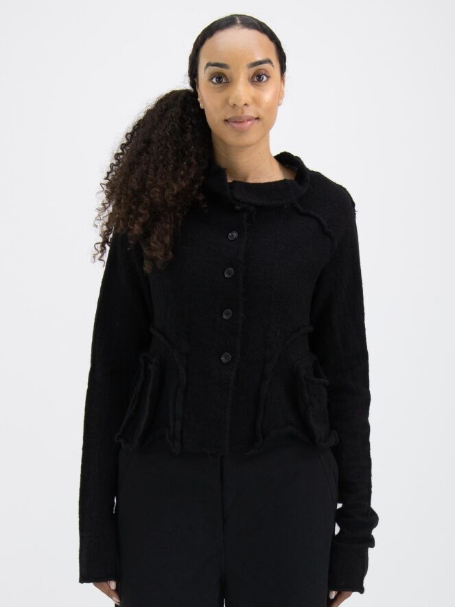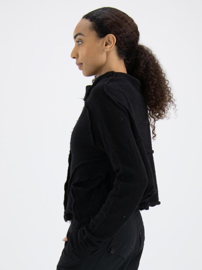 A short cardigan by Rundholz Black Label in black color. The front features multiple pockets of various sizes. The edges of the inverted seams are ruffled. This cardigan can be hand-washed.
