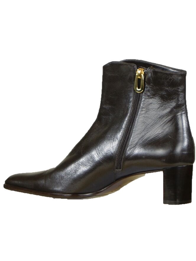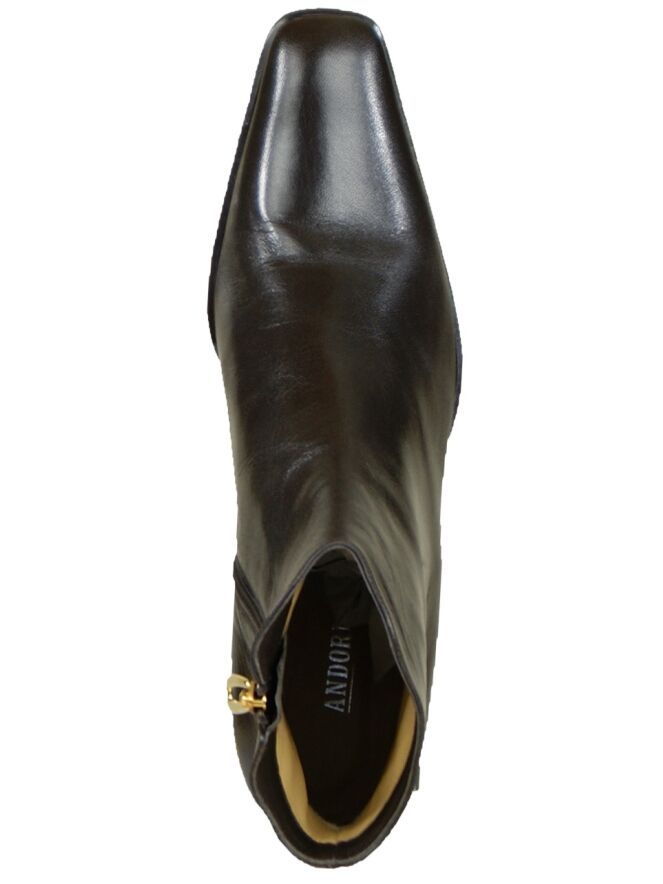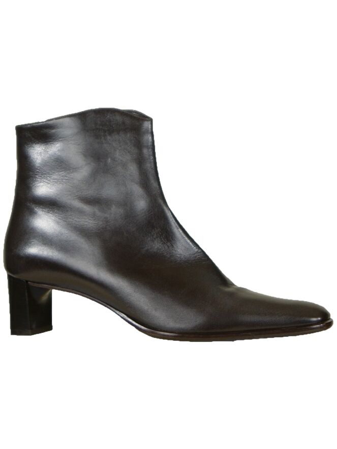 An ankle boot of the brand Salmaso in a mocha brown color in lambskin. The boot has a square nose and has a zipper with a gold-colored tab on the inside of the ankle boot. Hey boot is lined with leather on the inside