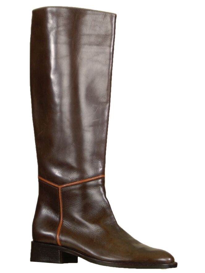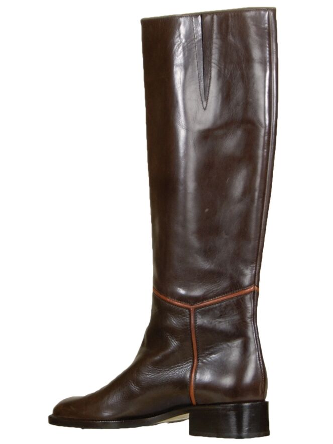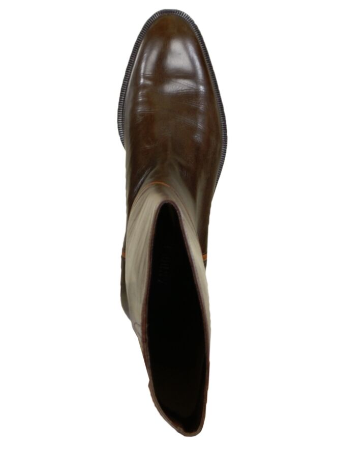 A tube  boot by the brand Salmaso in a chocolate brown color with a cognac band on the height of the ankle. The height of the boot is 42 cm and the shaft width is 37 cm. On the top of the shaft is an incision with elastic. This boot is leather lined on the inside.