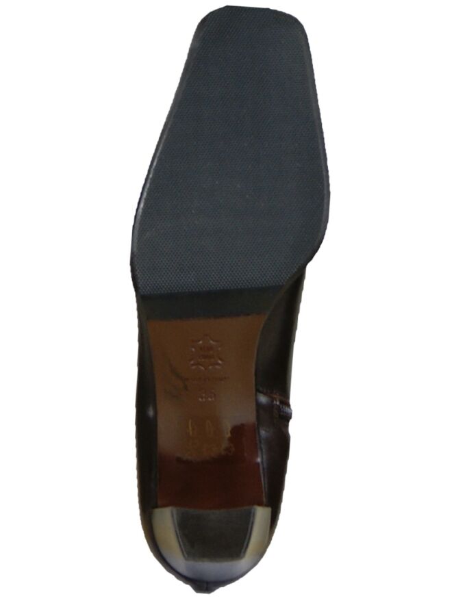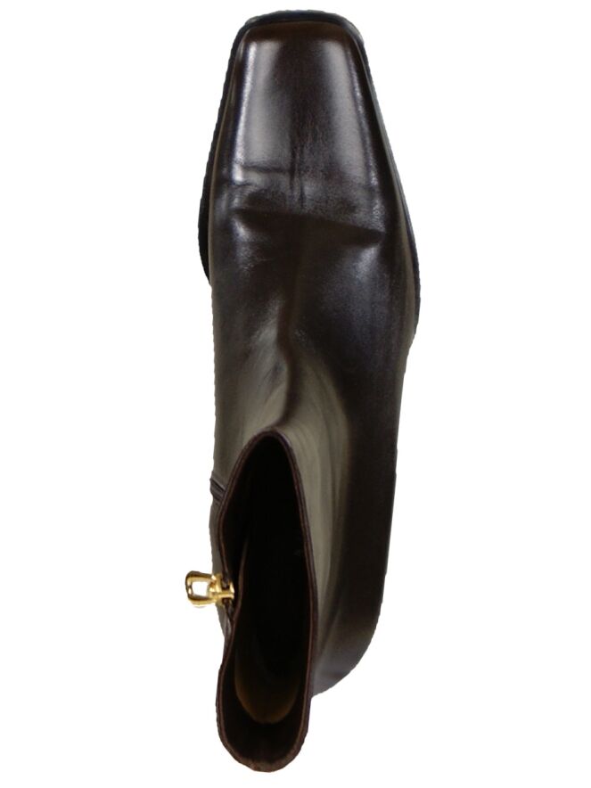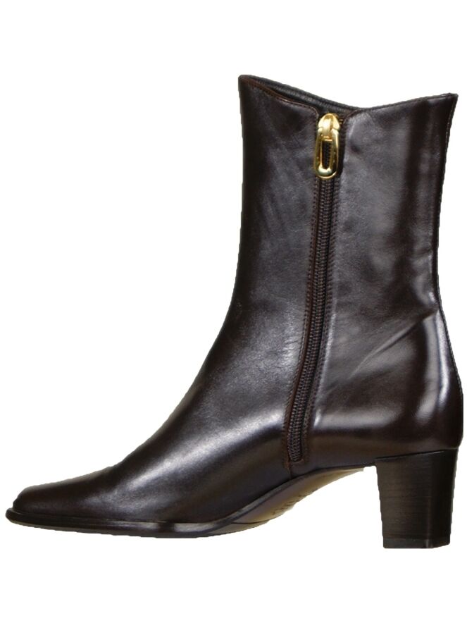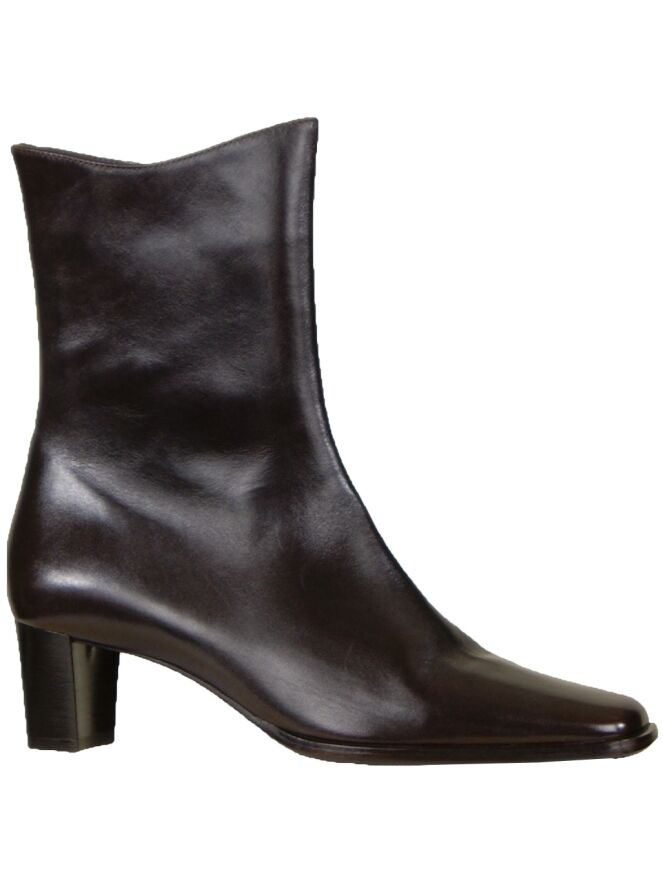 A high ankle boot by the brand Salmaso in the color moccha brown. The toe is in a square form and the heel is elegantly tapered. On the inside is a zipper processed. This ankle boot is lined on the inside with leather.