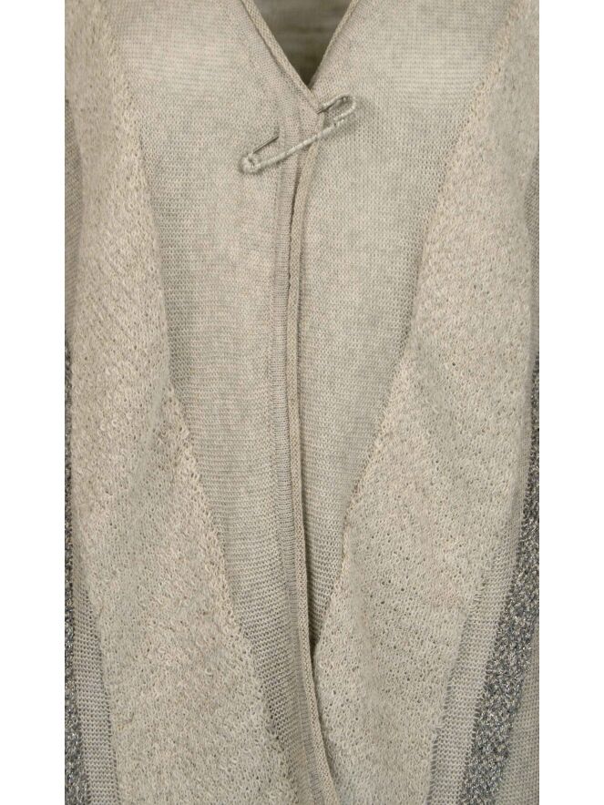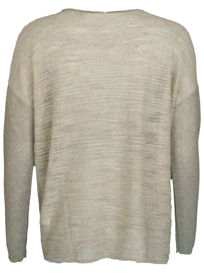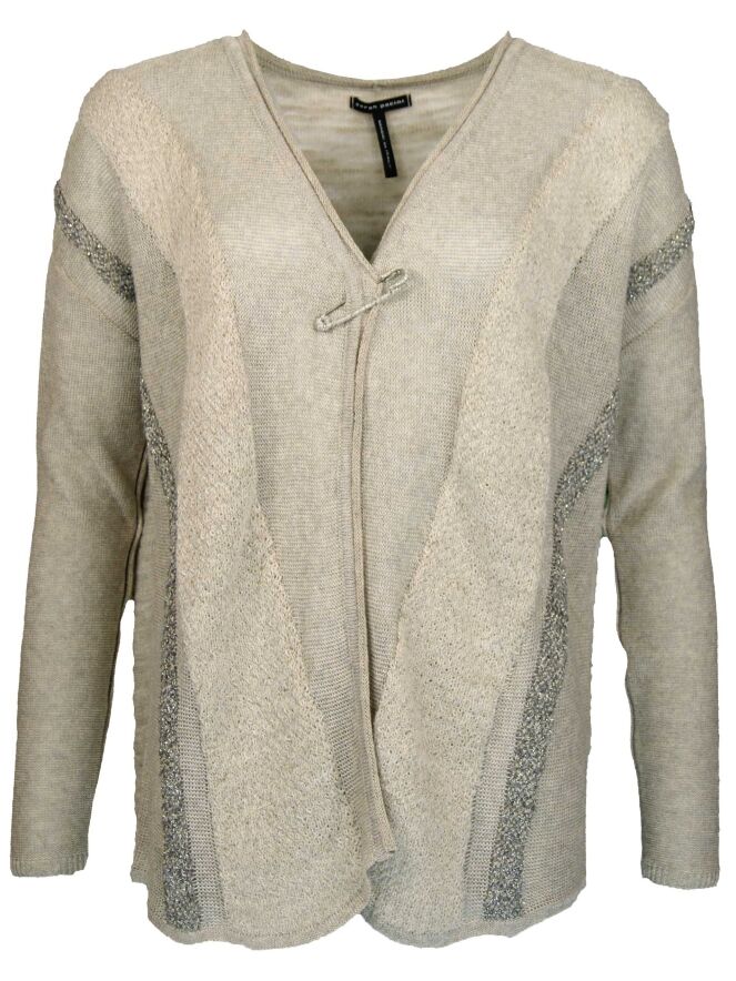 A knitted transparent vest from the brand Sarah Pacini in a sand color in multiple structures woven. At the front are 2 lines with a silver thread through the fabric woven. The vest has a V neck and has long sleeves. This pullover may be hand washed.