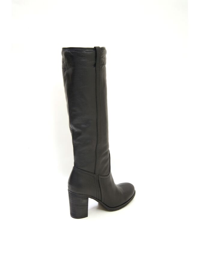 A tube boot from the Spazio Moda brand in a black color. The boot has a sporty, finely ribbed sole. Along the shaft run a leather trim on both sides. The shaft height is 40 cm and the circumference is 37 cm. The inside of the shaft is lined with faux fur.