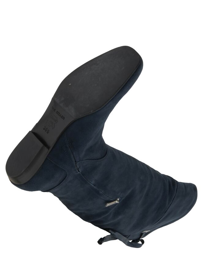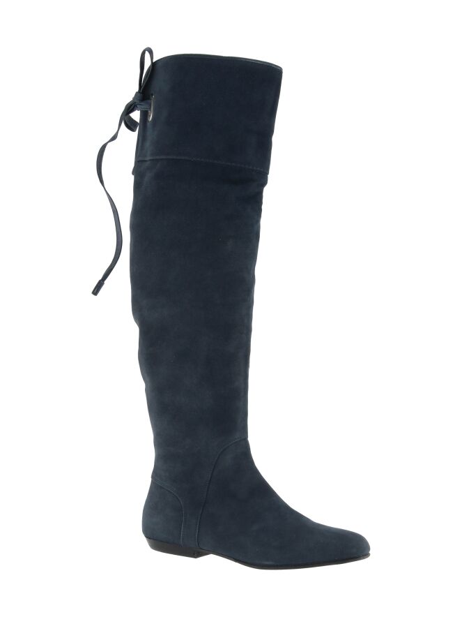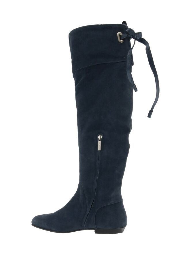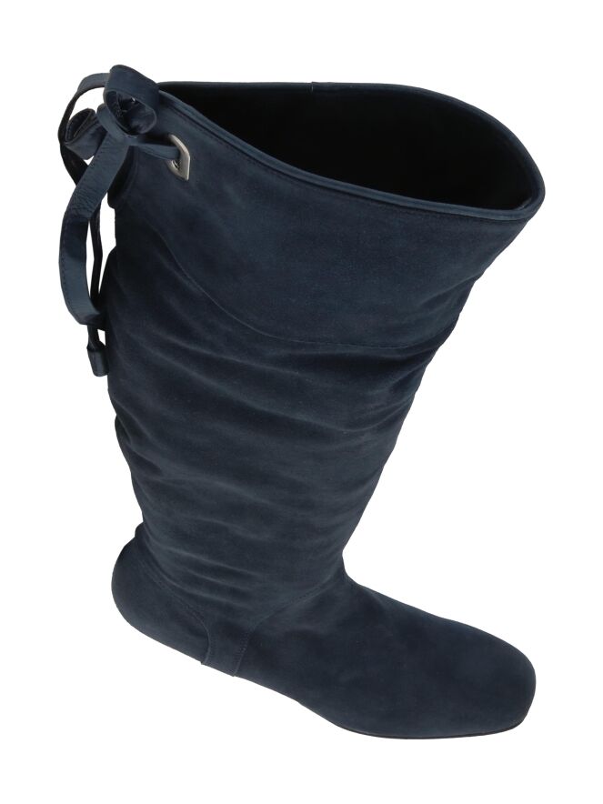 A high boot from the brand Spazio Moda in the color midnight blue. At the top of the shaft is a short cut-out at the back with a leather cord with which a decorative knot can be made. The edge of the shaft has a leather trim.