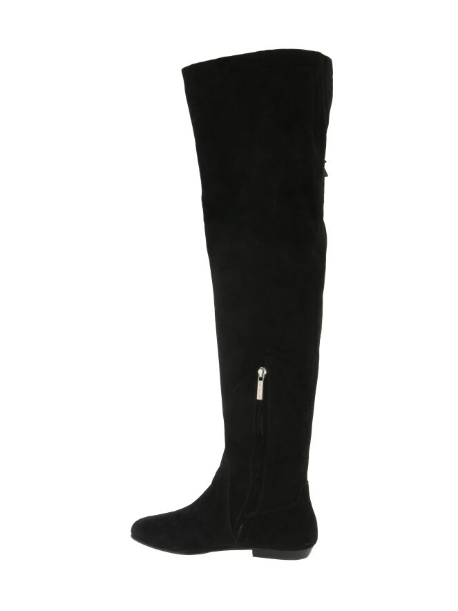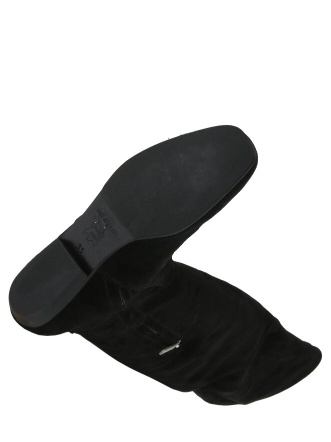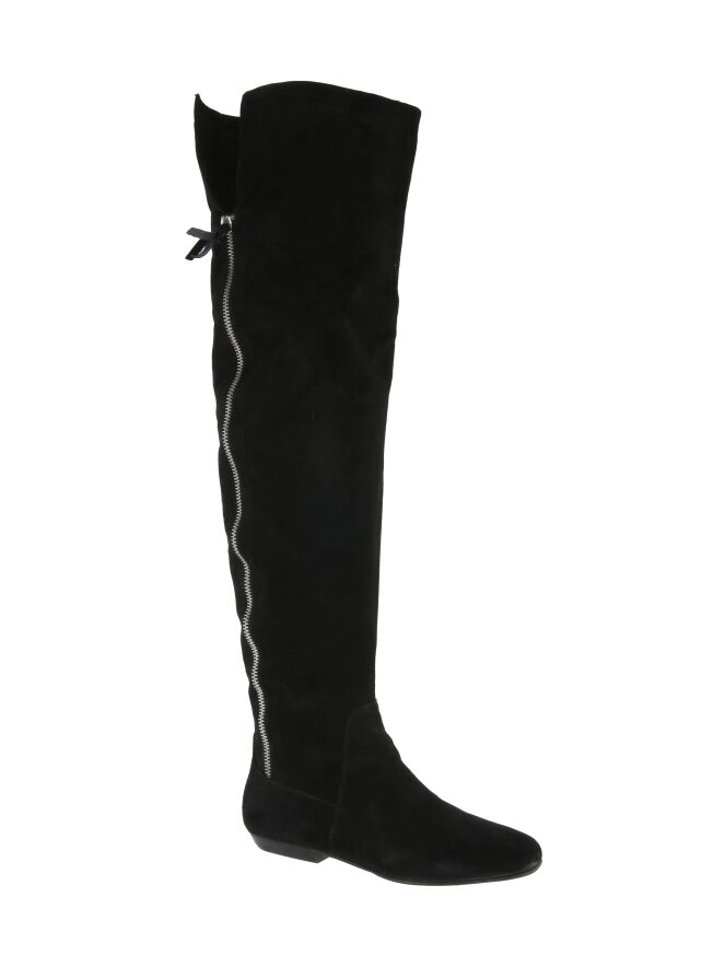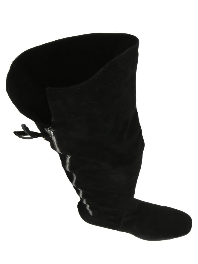 A fairing boot of the brand Spazio Moda in the color black. The boot has a zipper on the inside from the sole to well above the ankle. On the outside is a decorative silver colored zipper over the entire length of the shaft.