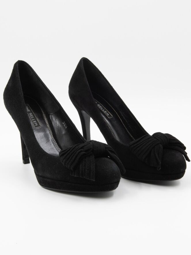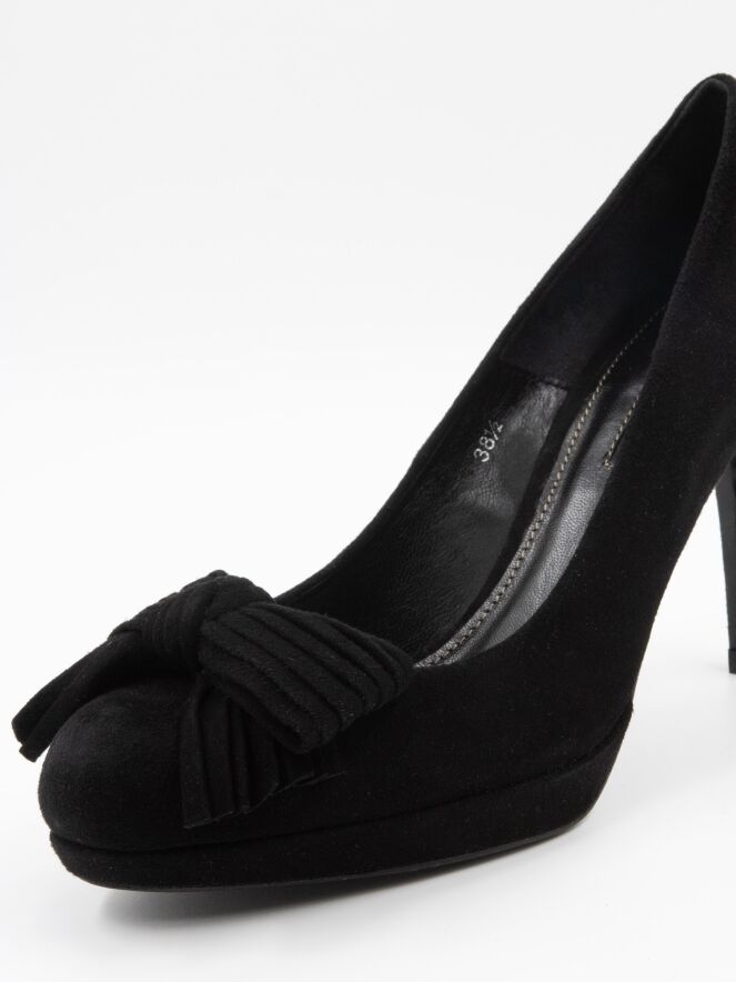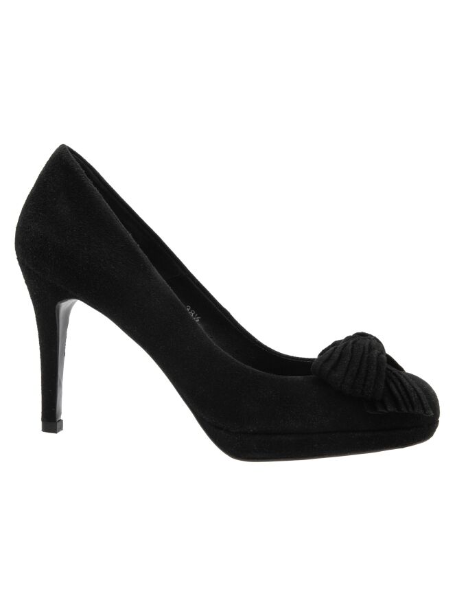 A pump from Spazio Moda in black. The pump features a platform sole and a decorative bow on the forefoot, constructed in layers. The pump has a round toe, and the high heel is covered in the same suede as the pump itself. The interior is lined with leather.
