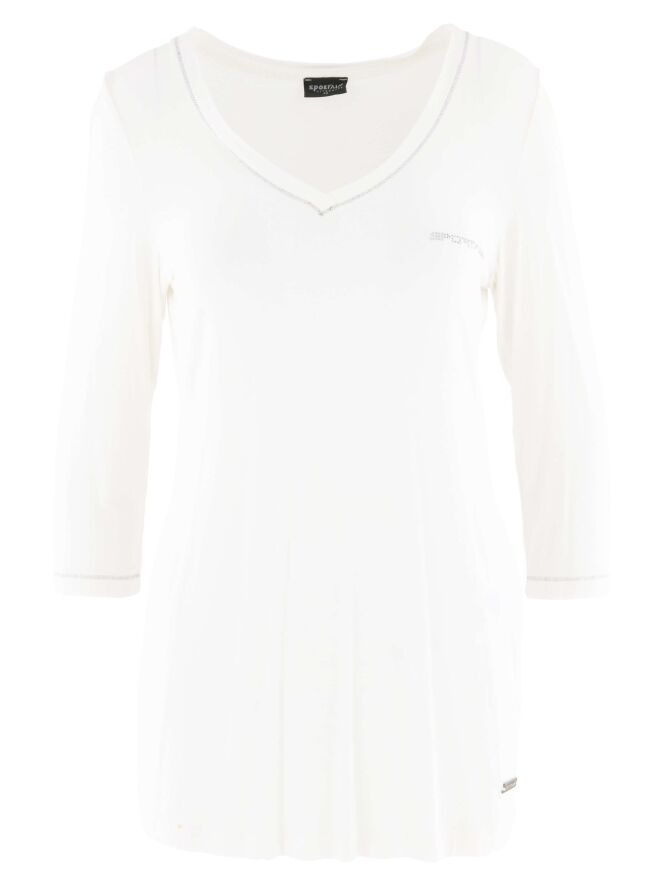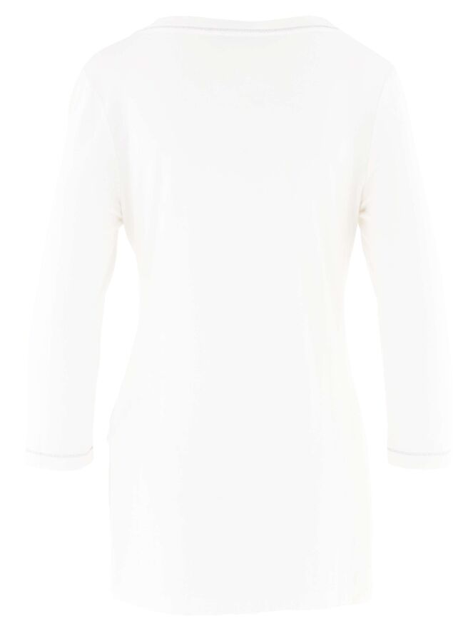 A long shirt in the color cream white from Sportalm. Along the edge of the V - Neck and the end of the sleeves is a gray stitching. This shirt can be washed at 30 degrees.