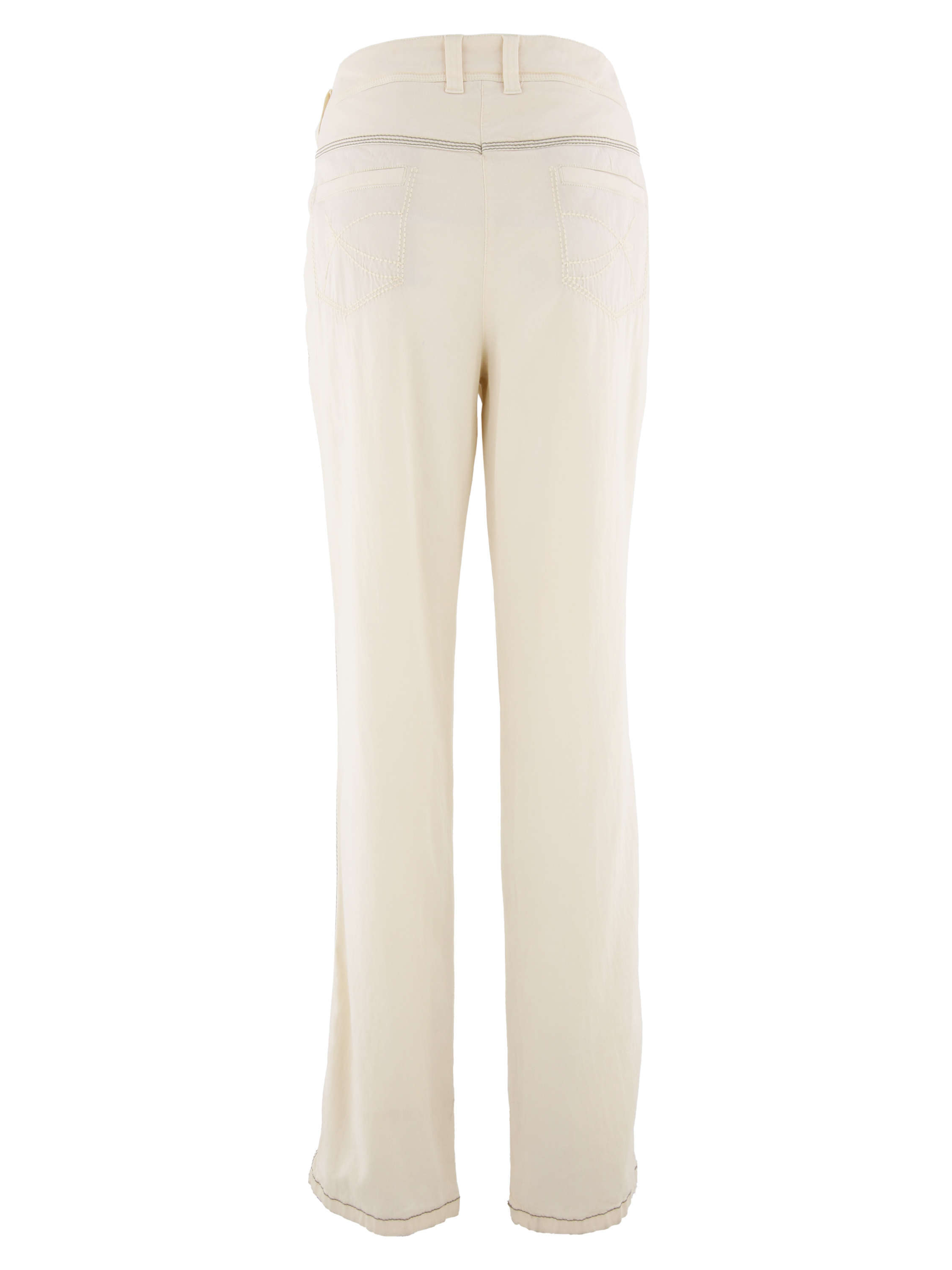 Pants from Sportalm in a cream color. There are mocha brown stitching along the edge of the pockets, the side and the bottom of the legs. These pants can be washed at 30 degrees.