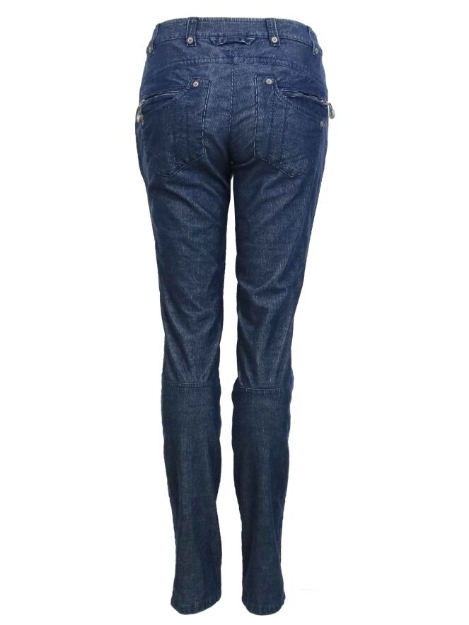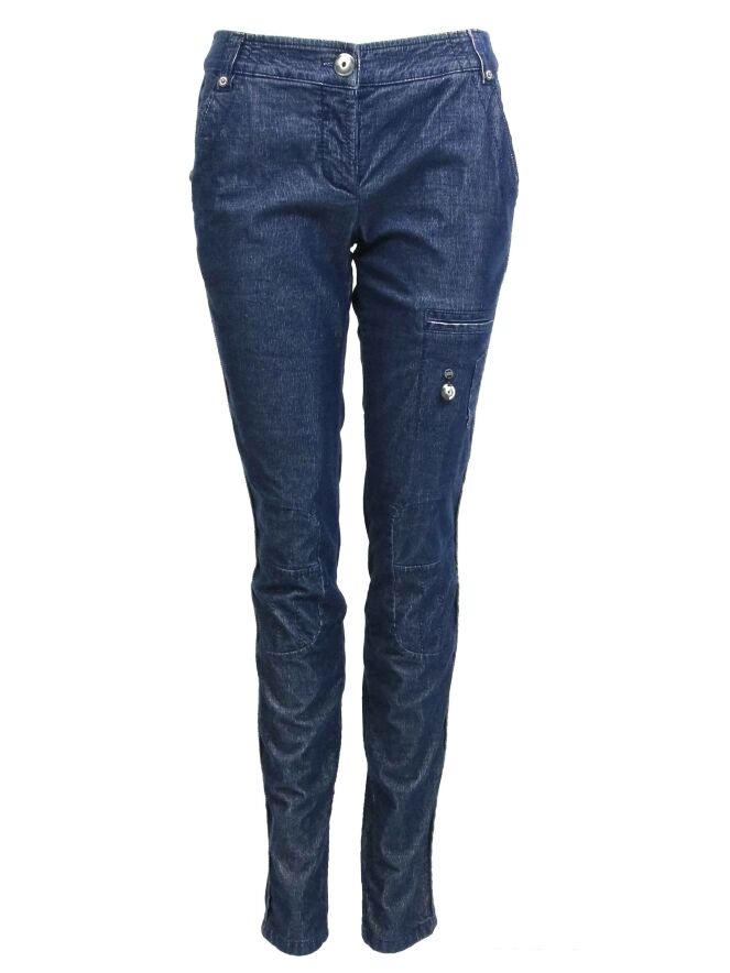 A pair of Sportalm ribcord pants in the color jeans blue. There are some decorative stitching at the knee. The pants have side pockets and can be washed at 30 degrees.