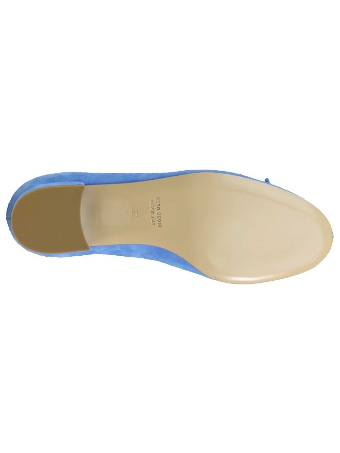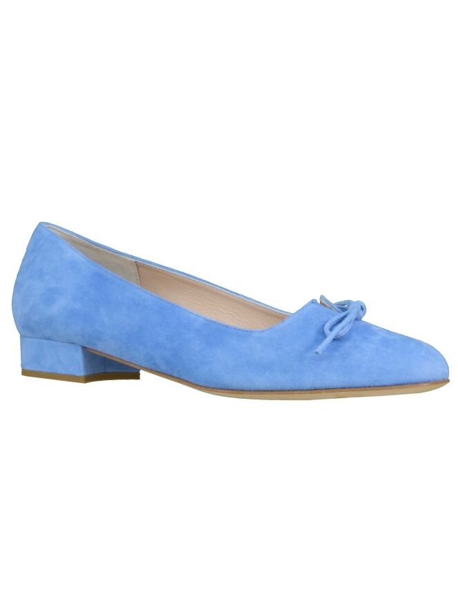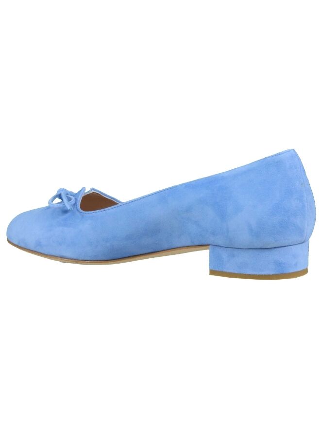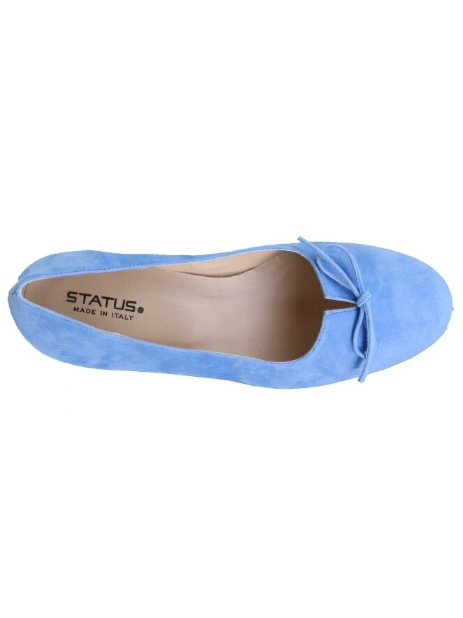 A Ballerina of Status in a pastel blue color. On the forefoot is a bow. The inside is lined with leather.