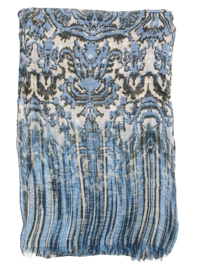 A luxurious shawl from stroke in a graphic print with multiple shades of blue and cream white. The ends of the shawl are finely frayed. This scarf must not be washed.
