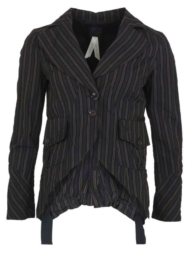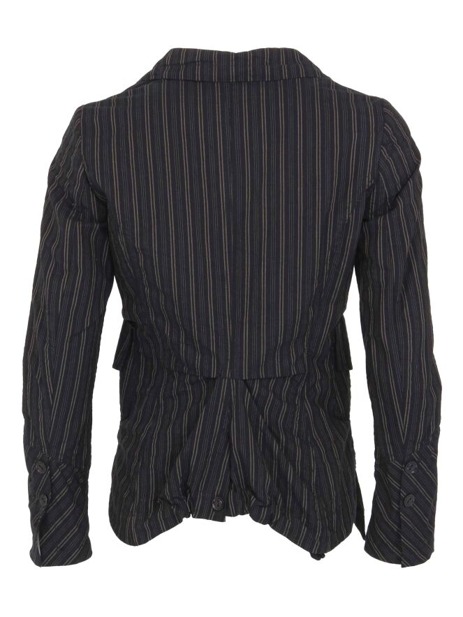 A blazer by Summum in a pinstripe with the colors anthracite and taupe. The blazer is round cut at the bottom and has two pockets on the sides that run to the rear. The blower is unlined and must not be washed.