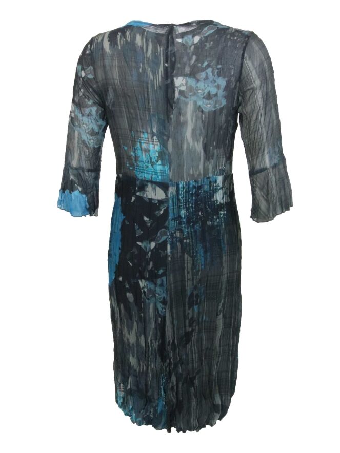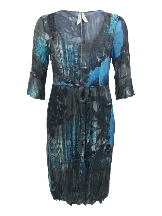A dress from Summum in a graphic print with multiple shades of aqua blue and black. The dress has a wrinkled fabric and half-long sleeves. at the waist is a belt in the same material as the dress. There are several buttons from the bottom of the spacious round neck. This dress can be washed at 30 degrees.