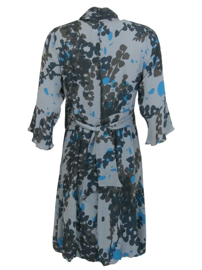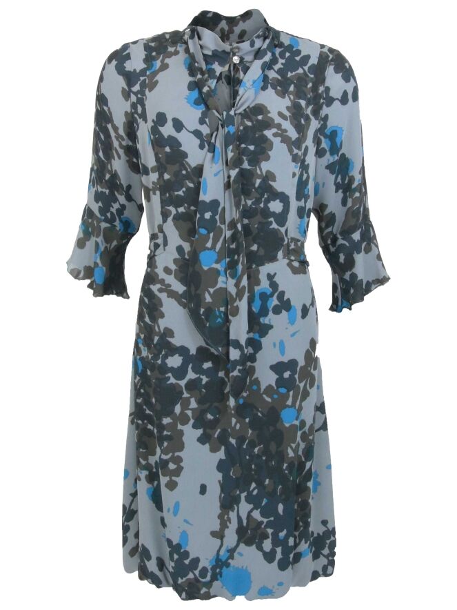 A dress from Summum in a graphic leaf print with the colors aqua blue and multiple shades of gray. There are a few loops in the neck that incorporate a decorative ribbon. In the waist are 2 ribbons that can be used as a belt. The dress has half long sleeves and the dress is lined from the waist. This dress can be washed at 30 degrees.