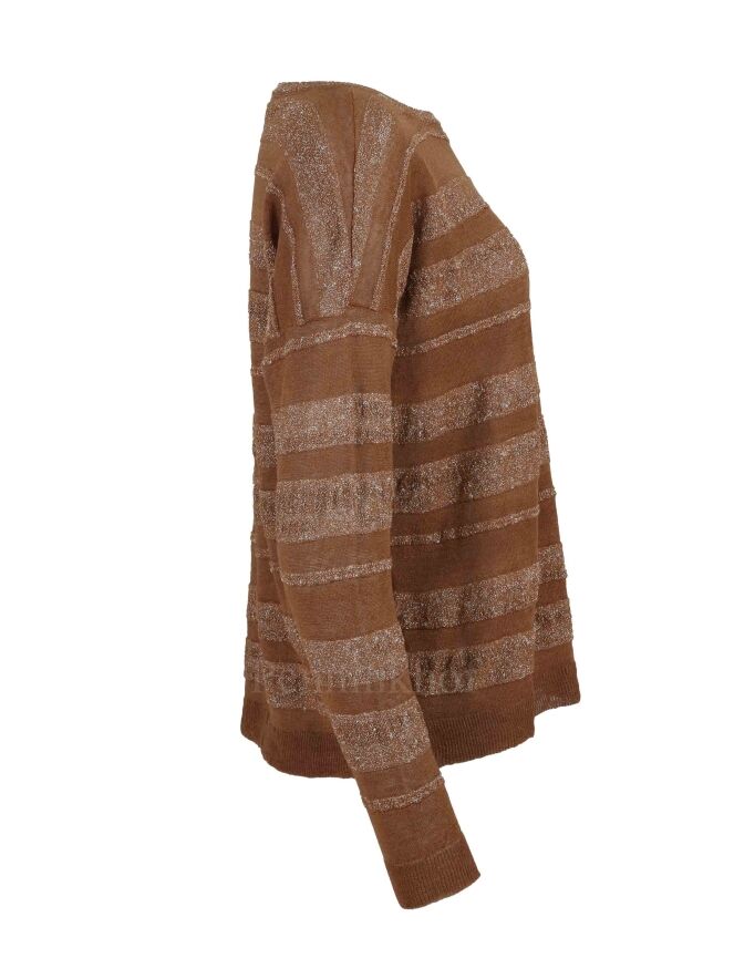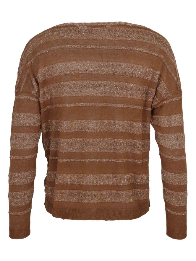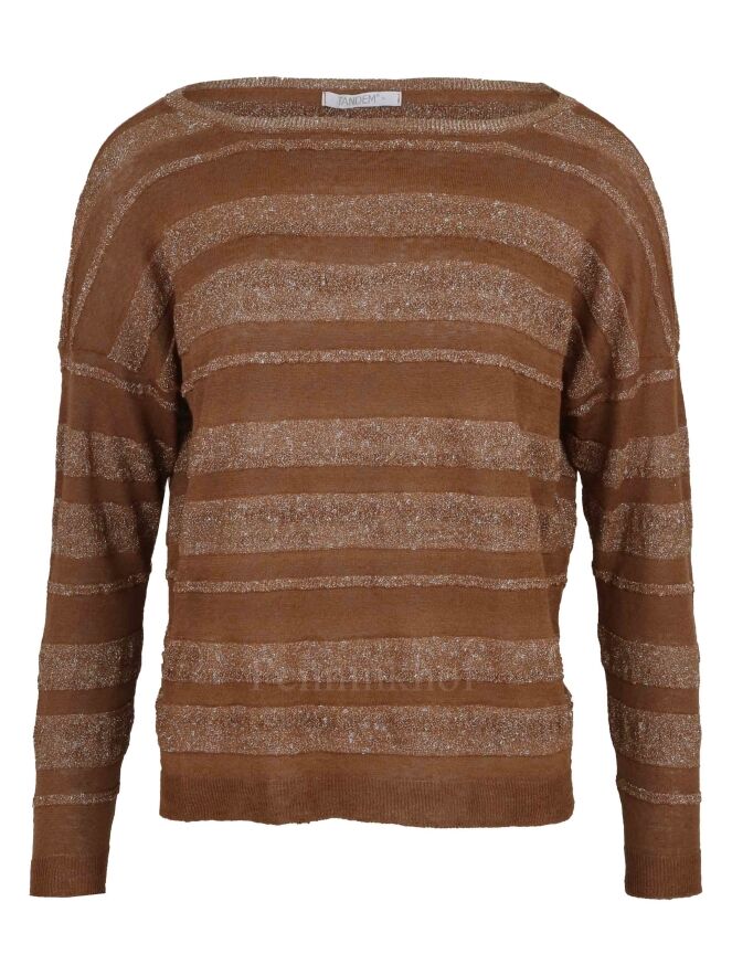A pullover from Tandem in a striped pattern with the colors brown and brown with a silver thread woven through it. The pullover has a round neck and can be washed at 30 degrees.