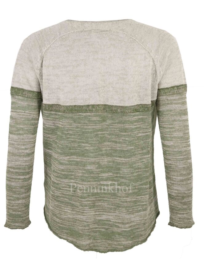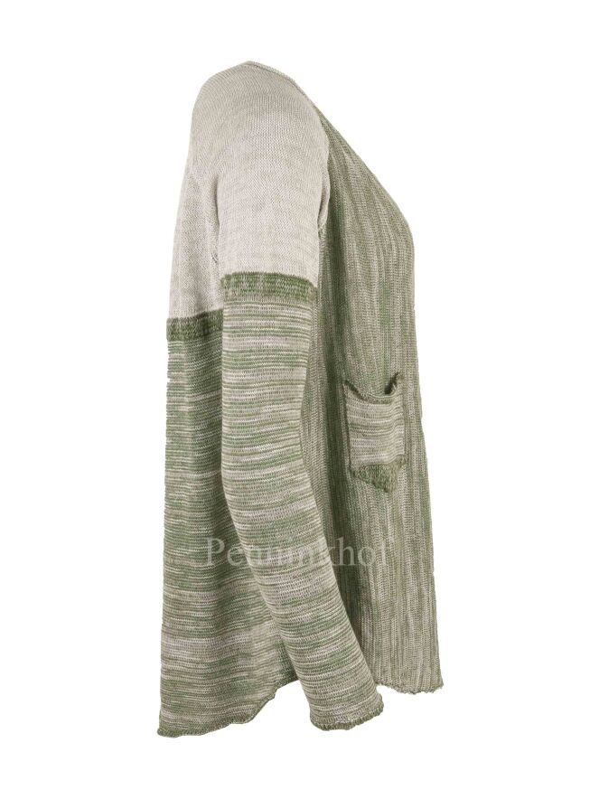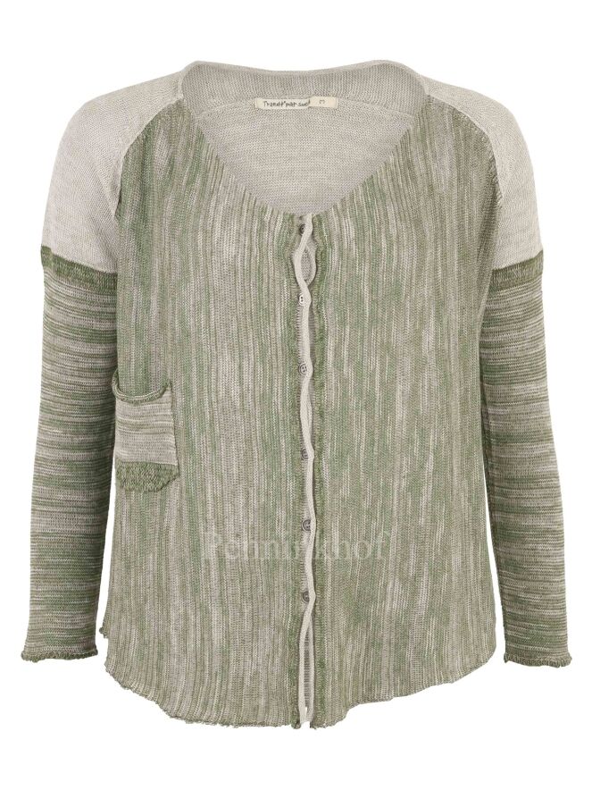 A mixed cardigan from Transit in the color olive green. The vest is in a beige color at the shoulders. Along the edge of the closure is a beige trim. This vest can be hand washed.