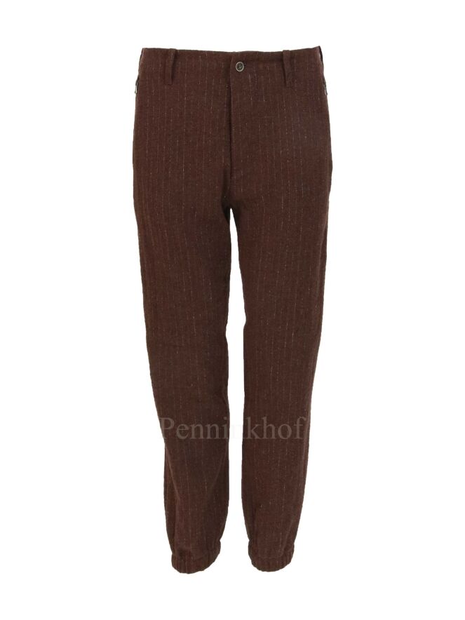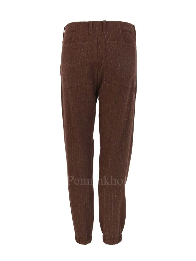 Transit pants in a pinstripe pattern with the colors rust red and cream white. The pockets have a zipper. At the bottom of the legs is a smocked elastic band. These pants can be hand washed.