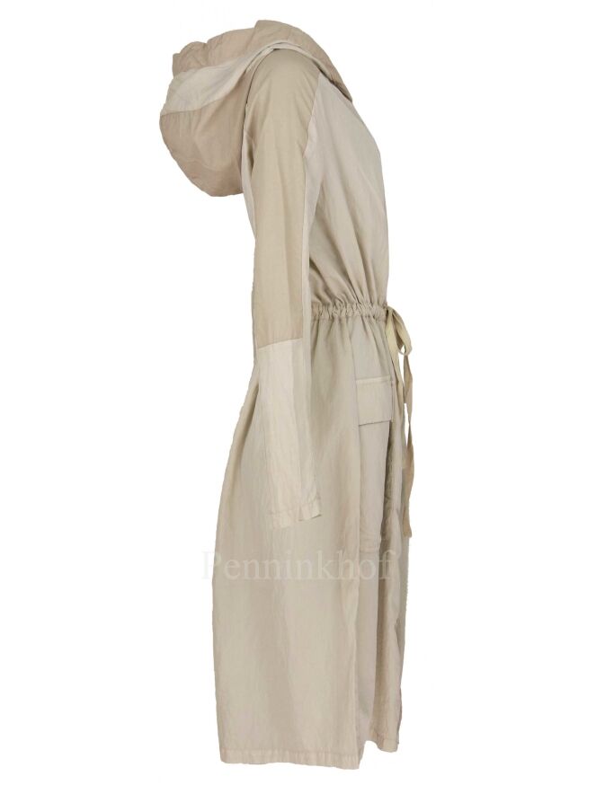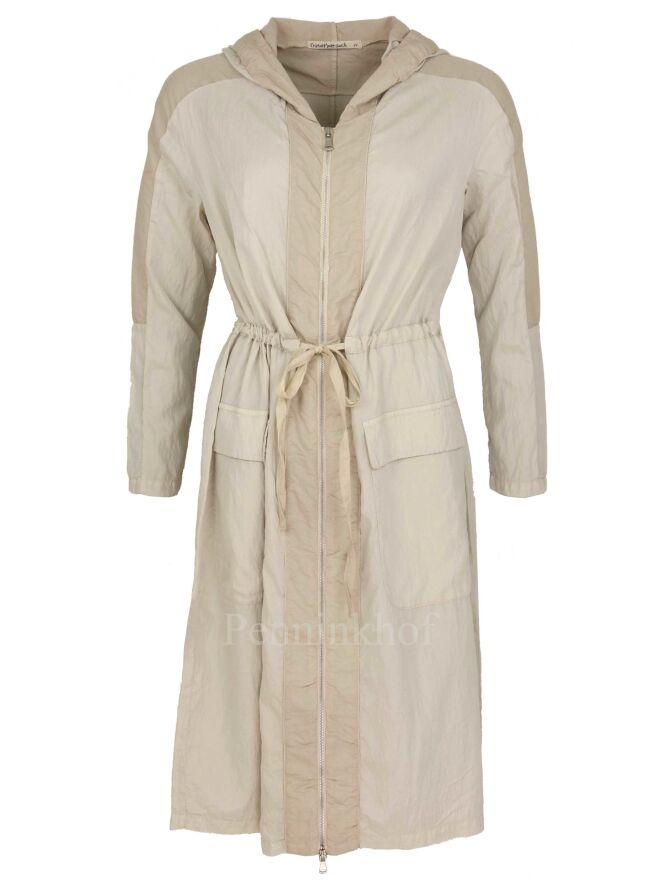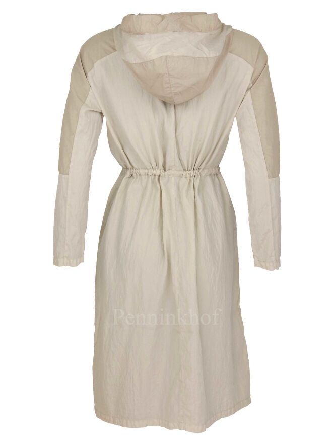 A jacket from Transit in a sand color. At the waist there is a cord that is integrated in a tunnel. below the waist are 2 pockets on both sides. In the middle of the front is a zipper with `` tone-on-tone '' trim on both sides. The jacket has a hood. The jacket can be washed at 30 degrees.