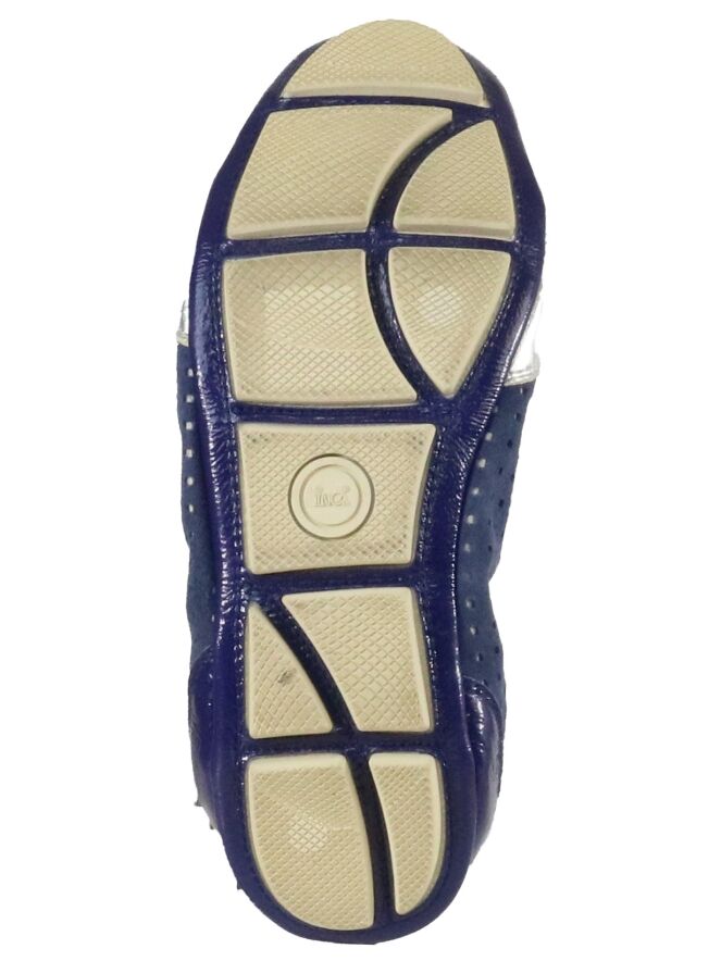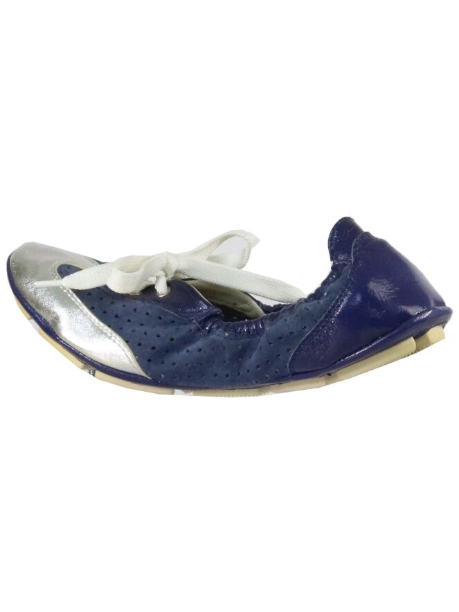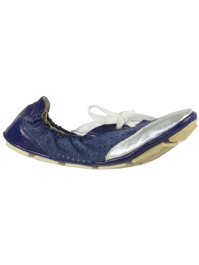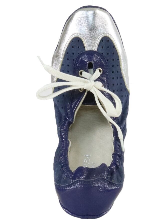 A ballerina from Valentin in the color cobalt blue. The toe is in a metallic silver color. The leather is finely perforated on the sides. The heel is in patent leather. There is a white lace on the forefoot. Along the edge of the shaft is a piping with an elastic processing.