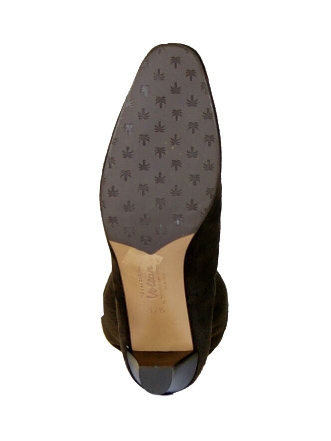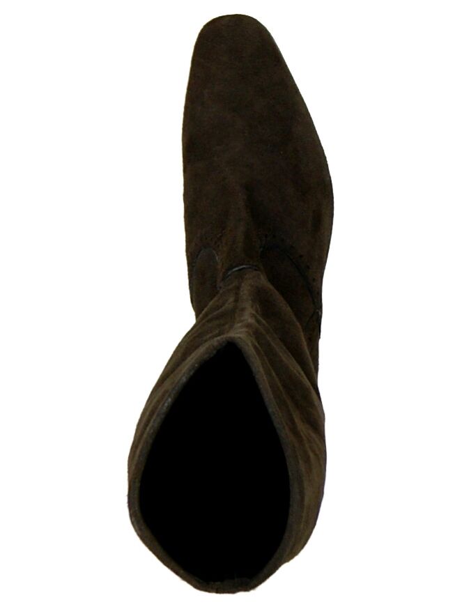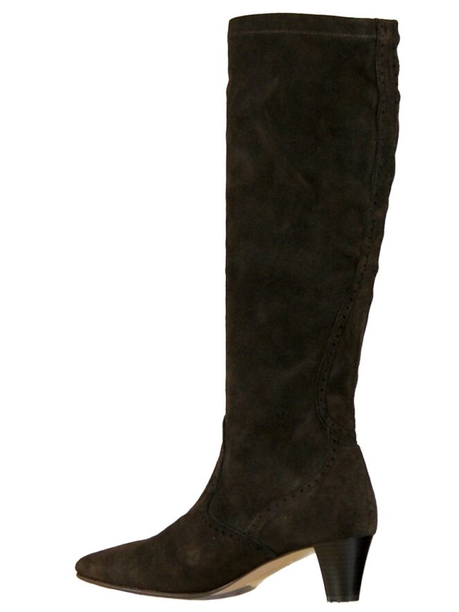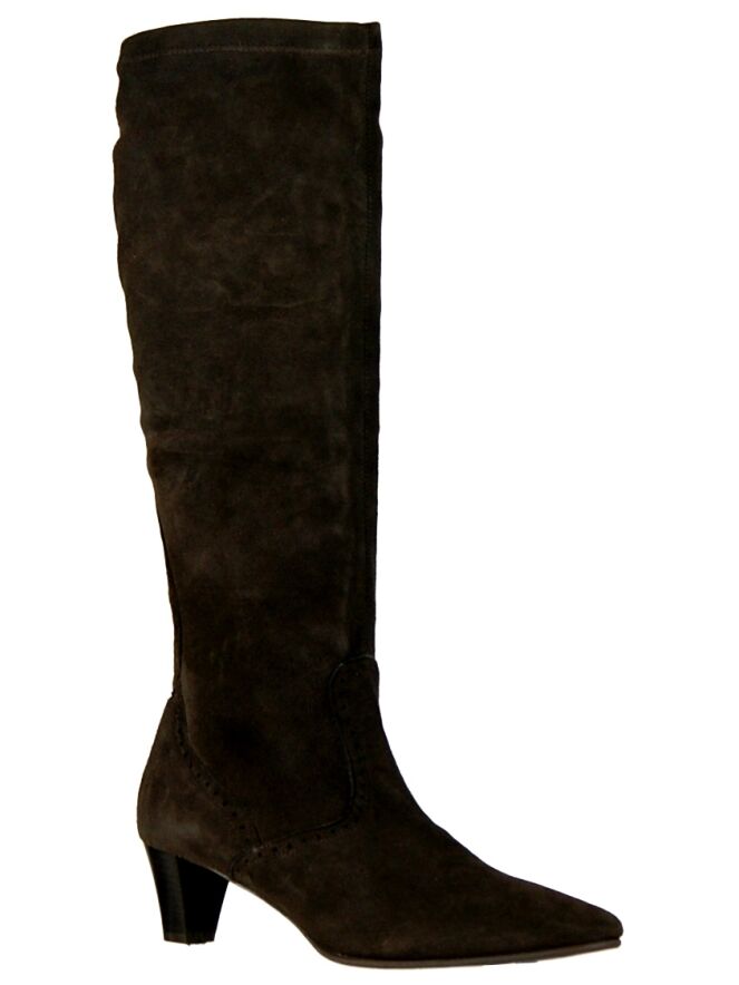 An elegant boot by the brand Voltan in the color moccha brown on an elegant heel of 4 cm high. The shaft is made of stretch suède and the circumference of the shaft is 34 cm. The length of the shaft is 37 cm. The boot has a slender forefoot.