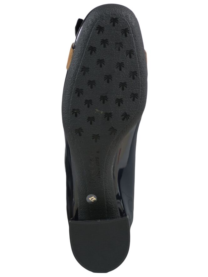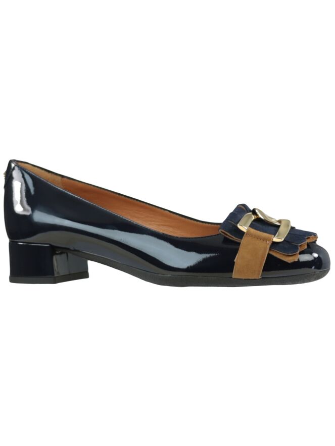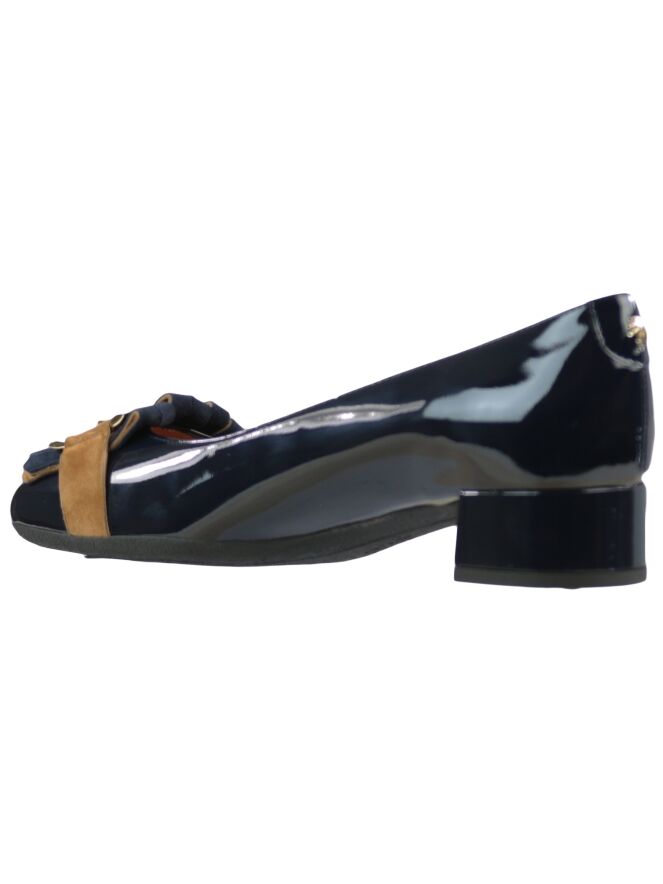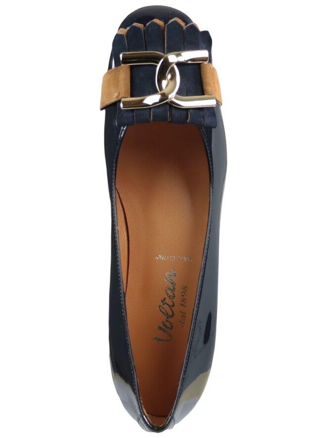 A loafer of the brand Voltan in the color Navy Blue. On the forefoot is a Suede jamboree in the color cognac with blue where over a gold-coloured chain-link buckle. The loafer has a block heel and the inside of the loaferis with leather lined. With this shoe is a bag with item number: 404041259