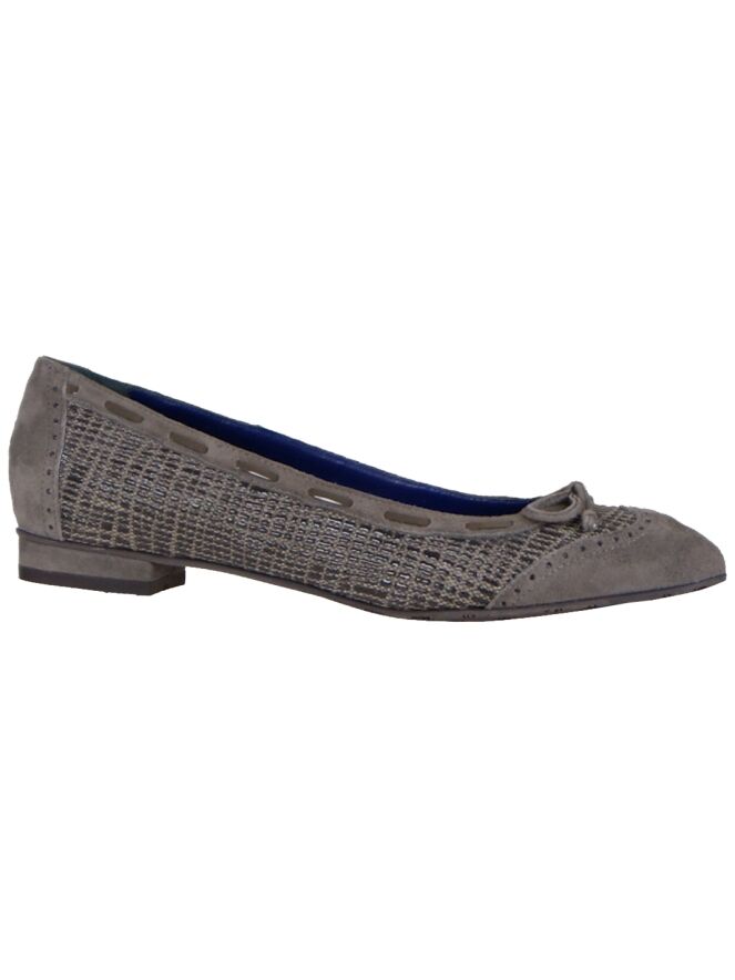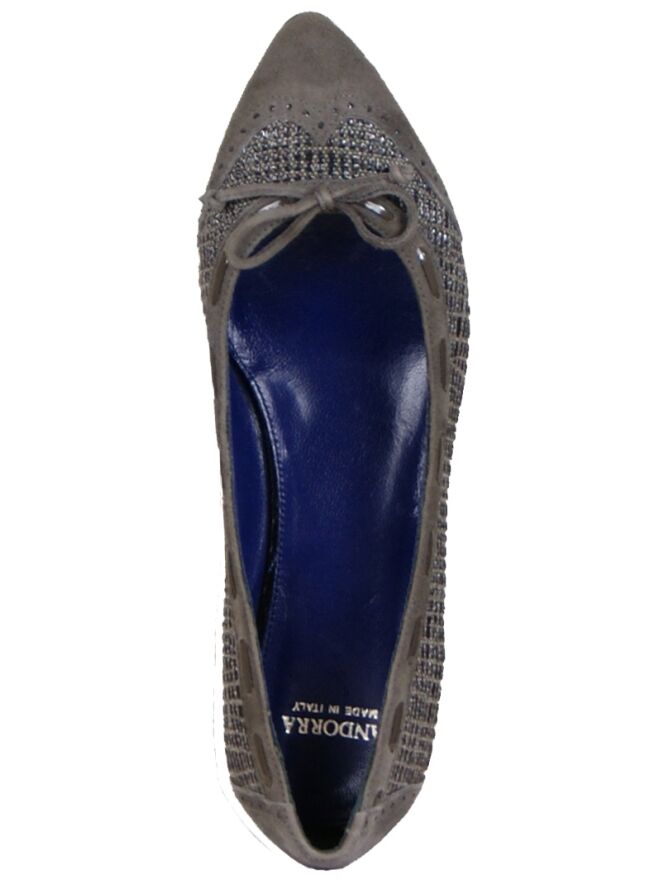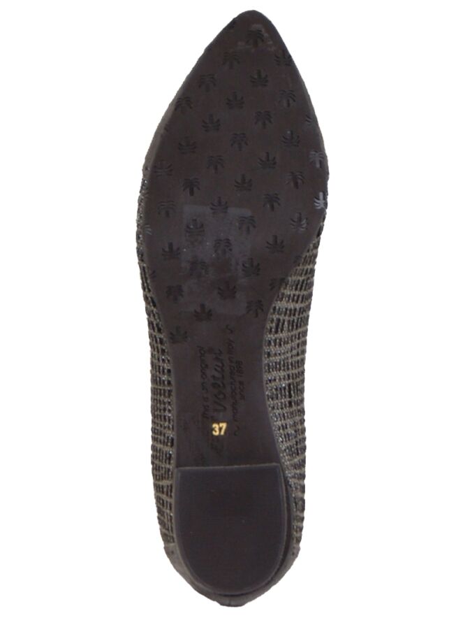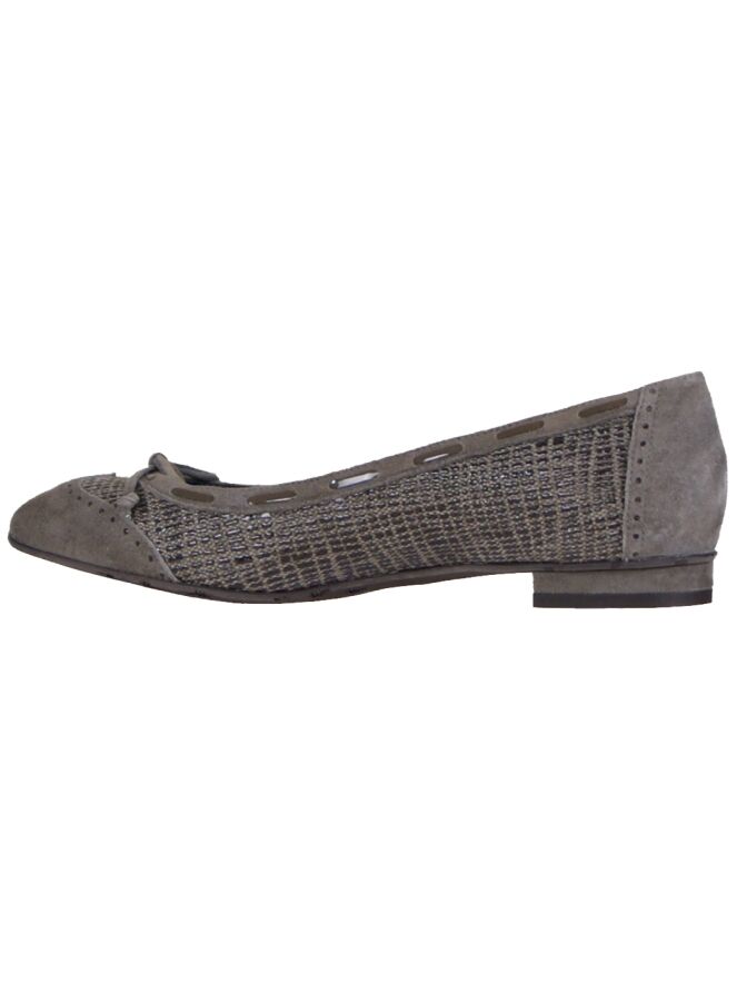 A ballerina from Voltan in a taupe embossed print and a pointed toe which is covered in camoscio suede. The heel and heel are also covered in plain suede. A small bow is attached to the forefoot. The inner lining is made of leather.