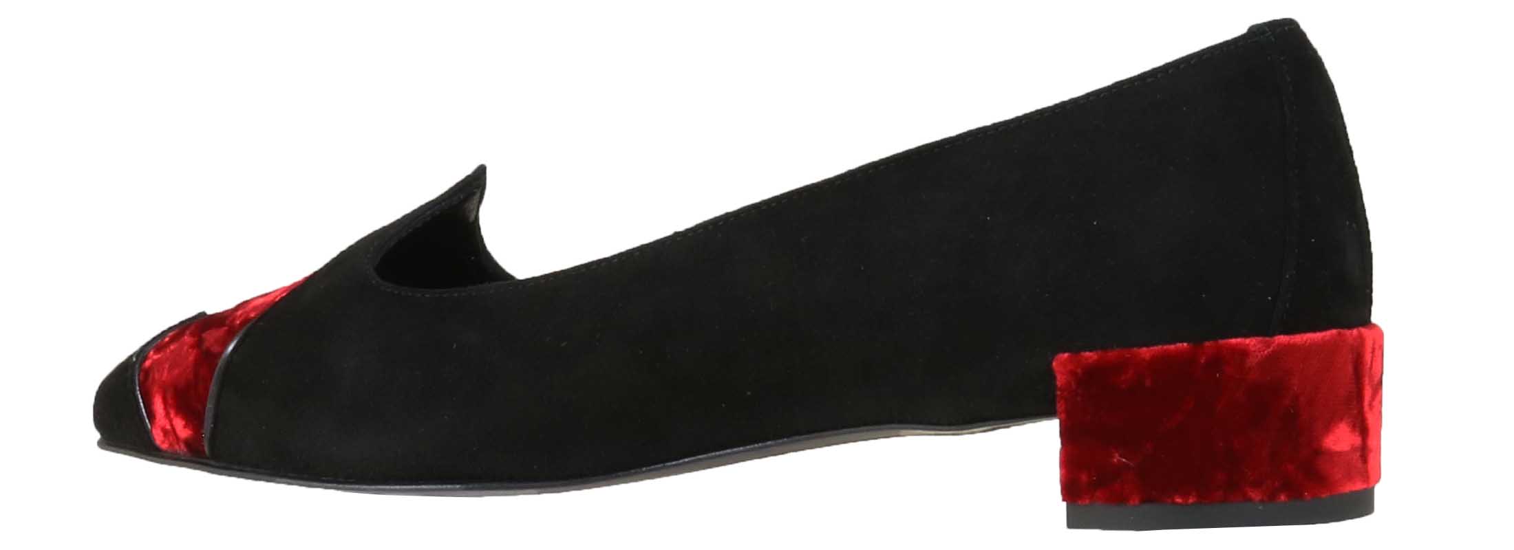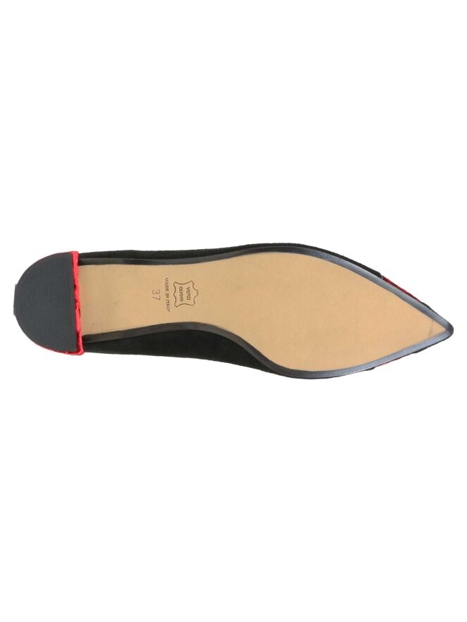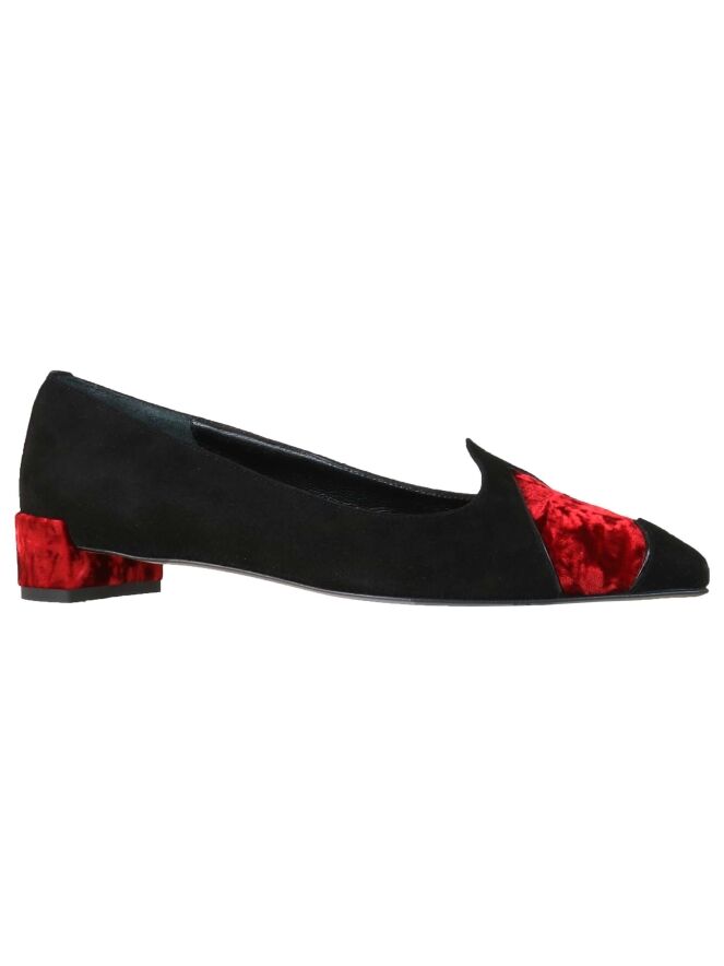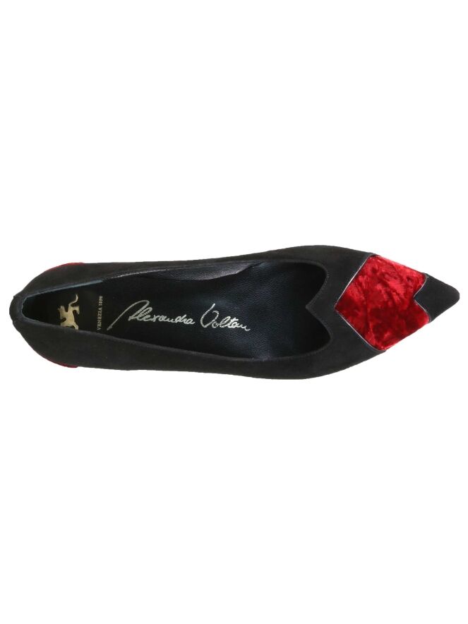 A pump of Voltan in the color black. Decorative red velvet is on the forefoot. The heel is covered with the same red velvet. The toe is pointed and the pump is lined with leather.