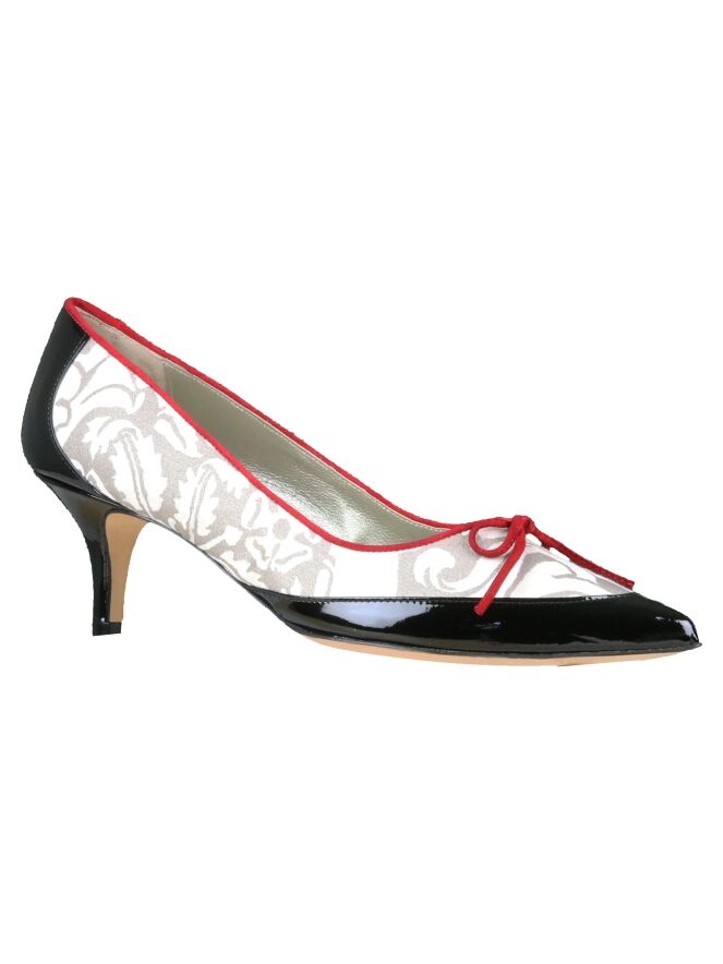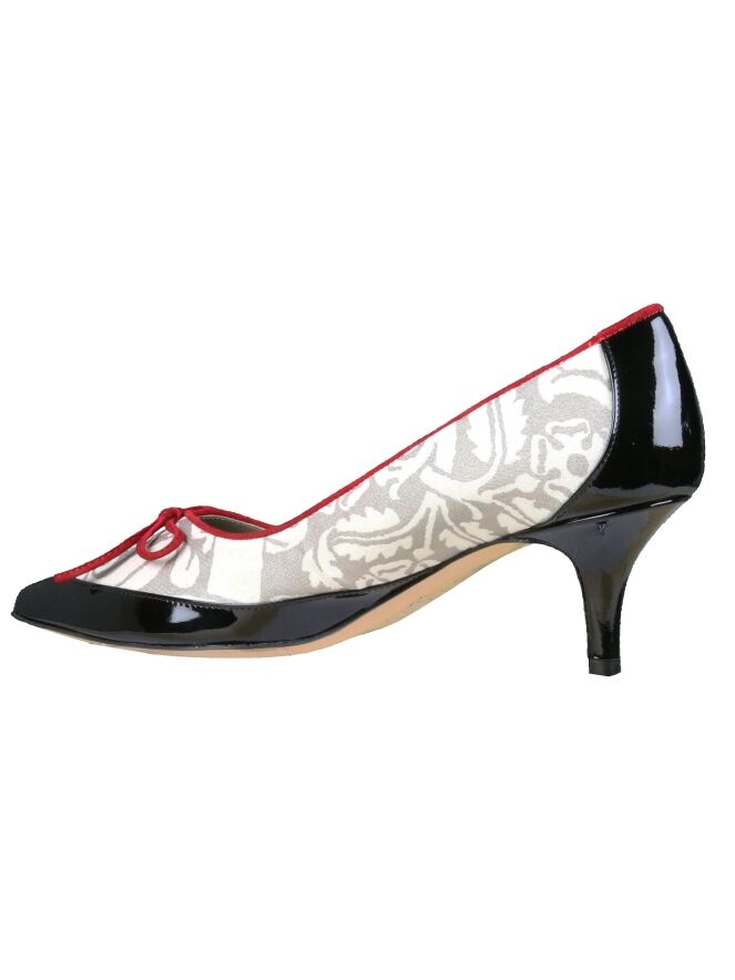 A pump by Voltan in a graphic print with the colors beige and creamy white. On the forefoot is a bow in burgundy red. the Edge of the pump has a piping in the same color. The edge of the forefoot, toe, heel and heel are in black patent leather. The inside is lined with leather. With this pump is a shoulder bag in the same composition with article number: 404000169.
