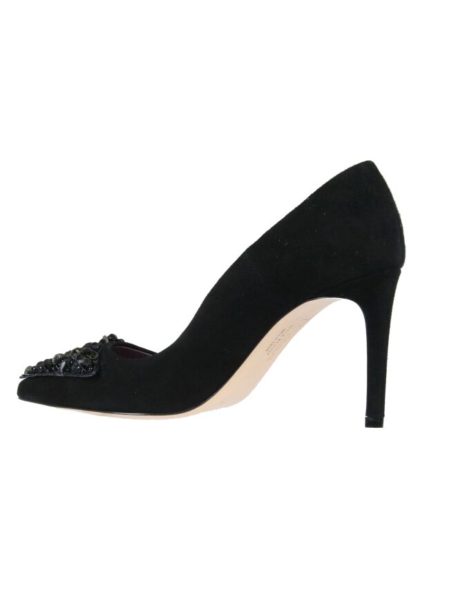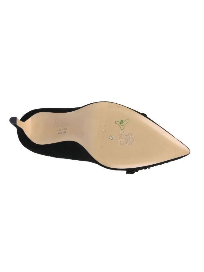 A pump from Voltan in the color black. Over the forefoot is a triangular decoration of rhinestones and spangles. The nose is pointed and the inside is lined with leather.