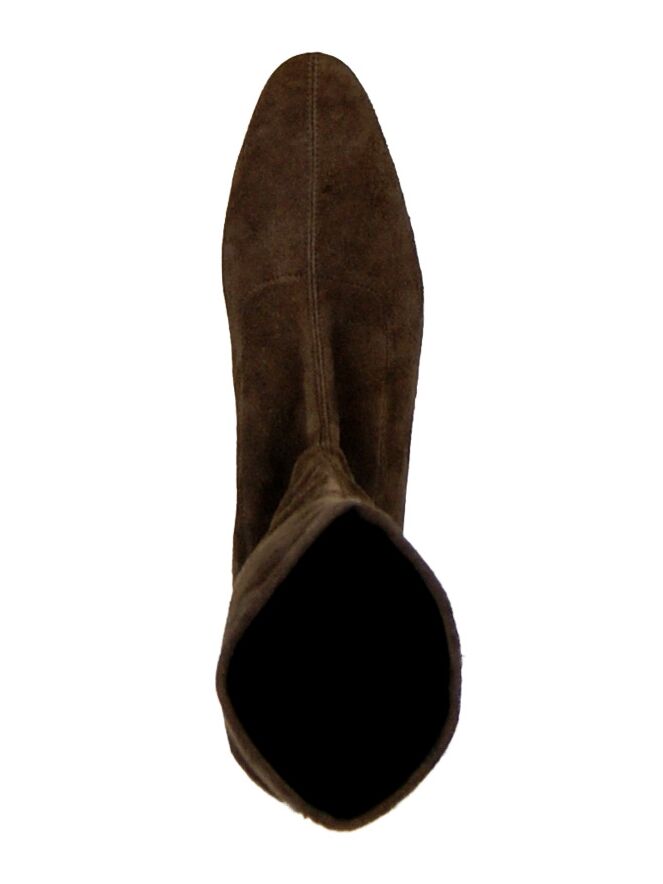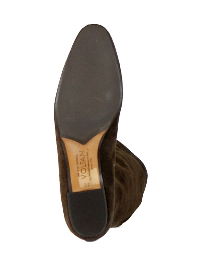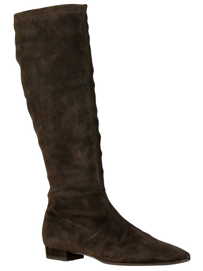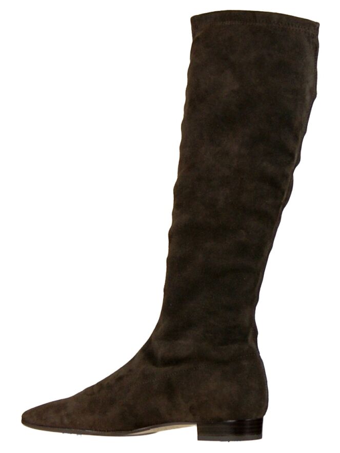 An elegant boot by the brand Voltan in the color moccha brown on a low heel of 2 cm high. The shaft is made of stretch suède and the circumference of the shaft is 34 cm. The length of the shaft is 37 cm. The boot has a slender forefoot.