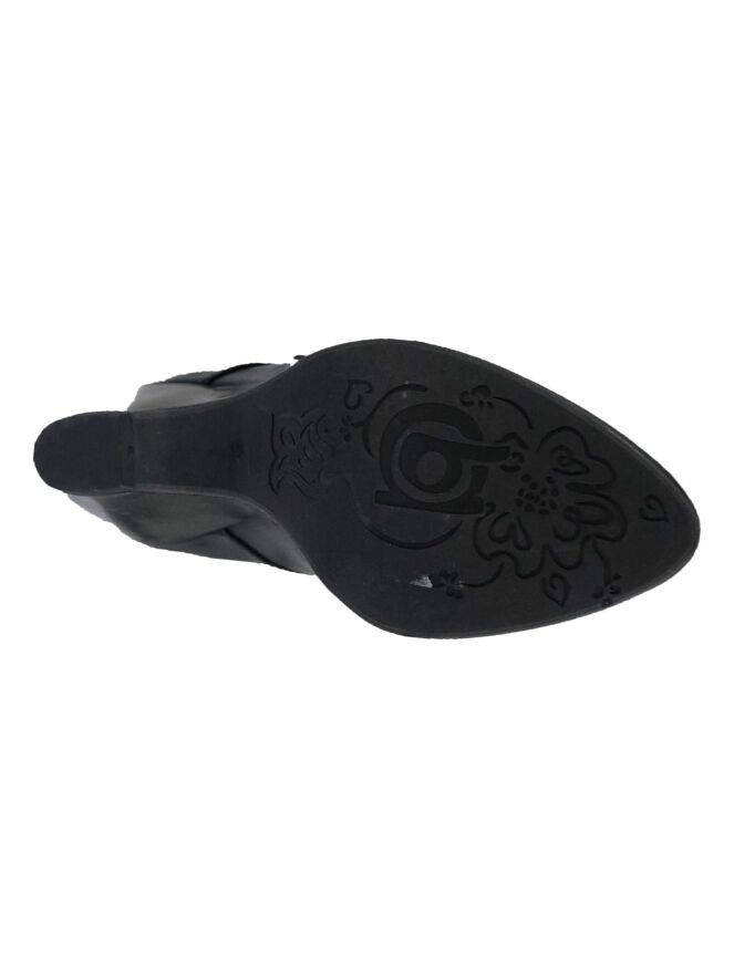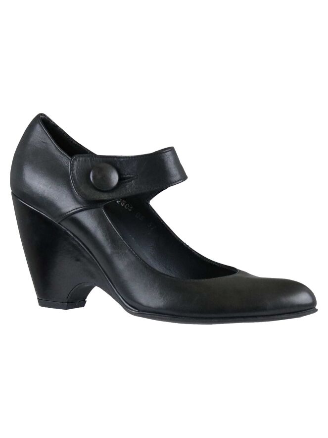 A pump from Zapa market in the color black. Over the instep is a strap with a button closure. The pump has a round nose and the inside is lined with leather.